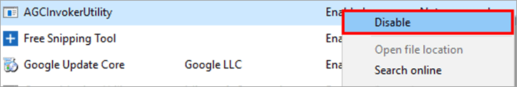 #3) In the next step, right-click on the “AGCInvokerUtility” option and then click on “Disable” from the list of options available as shown in the image below.