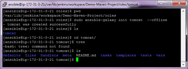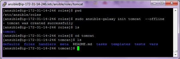 $ cd /etc/ansible/roles $ sudo ansible-galaxy init tomcat --offline