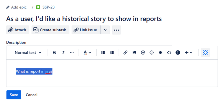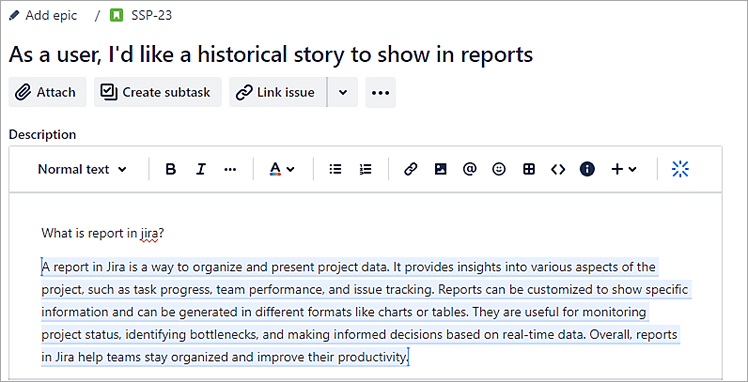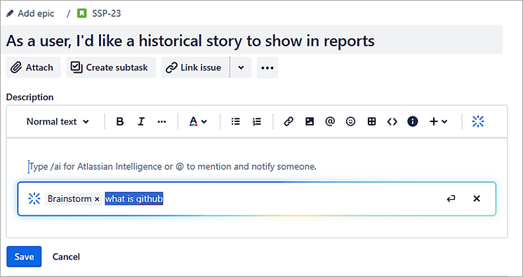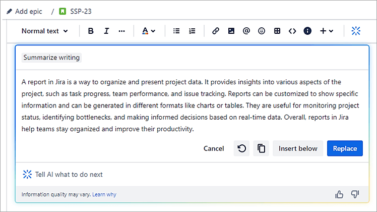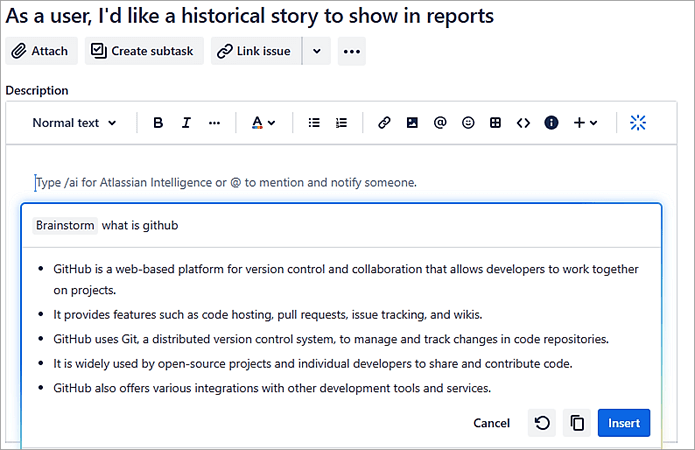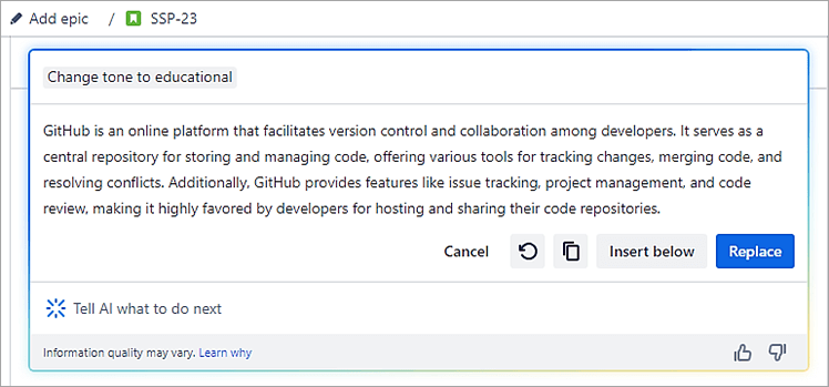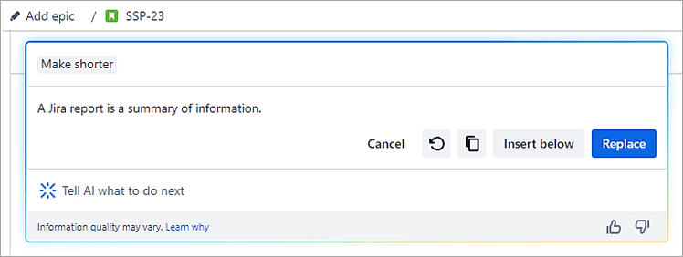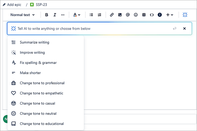 • Generate and Transform Content: Add new content in issue descriptions and comments with the prompts. Also, you can transform content to make technical information easier to understand