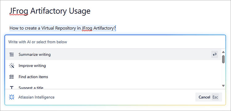 Using Atlassian Intelligence in Confluence can help to improve your writing and also streamline your work. With the Atlassian Intelligence feature, you can do the following: