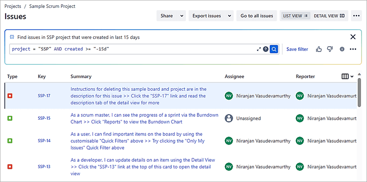 Example #2: Find issues in the SSP project that were created in the last 15 days.