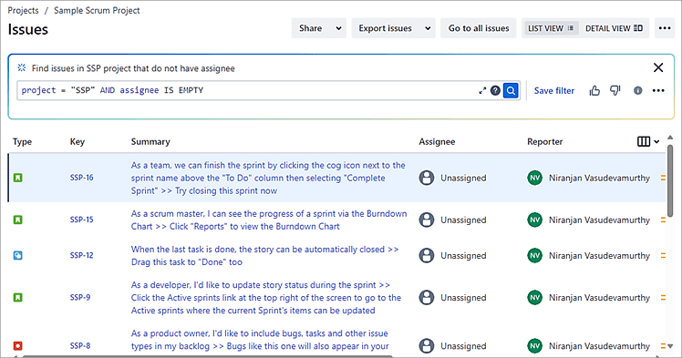 Example #3: Find issues in the SSP project that do not have an assignee.