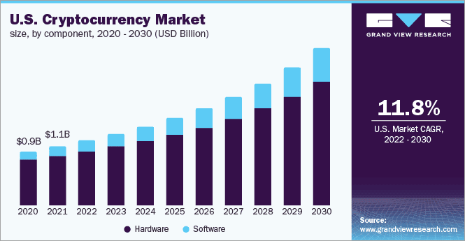 - As seen in the chart above, the US crypto market will grow at a CAGR of 11.8%. The global crypto market will expand at a CAGR of 12.2% from 2022 to 2030 to reach USD 11.71 billion by 2030.