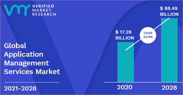 According to a report by Verified Market Research, the application management services market size is anticipated to increase to USD 88.49 billion by 2028 from USD 17.28 billion in 2020, increasing at a CAGR of 22% between 2021 and 2028.