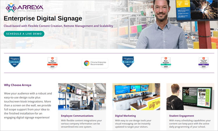 Our Review: Arreya Digital Signage is recommended for its never-ending list of features to create any digital signage content including a photo editor, free templates, dynamic widgets, status notifications and more. It caters to sectors such as healthcare, retail, schools, government agencies, and others.