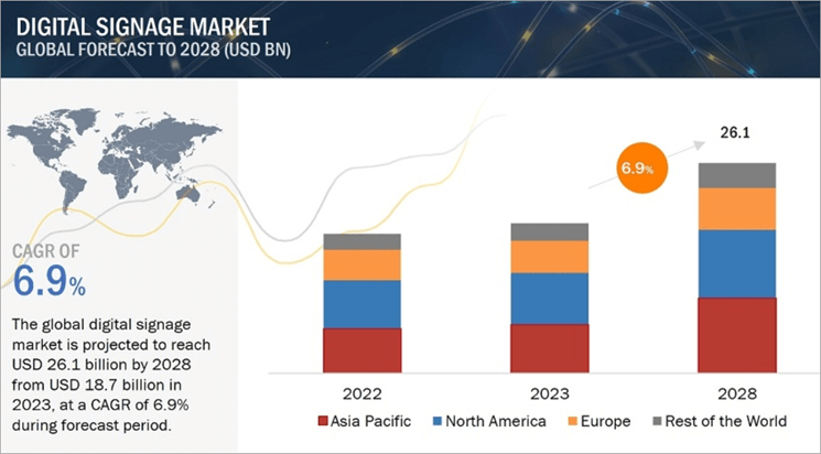 According to the research by Markets and Markets, the global market share of digital signage for the forecast period of 2023-2028, is expected to rise up to $26.1 billion to 2028 with a CAGR of 6.9%. It was valued at $18.7 billion in 2023.