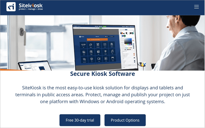 SiteKiosk is the most easy-to-use digital signage software that helps in designing screen layouts such as self-service ordering terminals, product advisors, digital signage displays or employee PCs and tablets, managing them and publishing them remotely at your convenience.