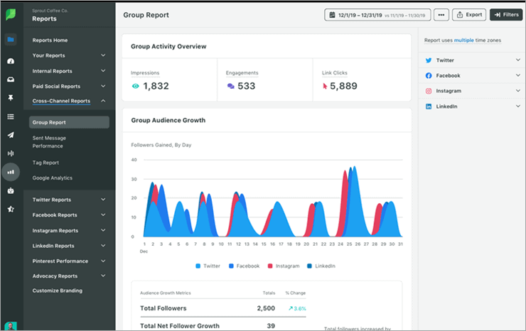 • Sprout Social provides paid social reporting for Instagram, Facebook, Twitter, and LinkedIn.