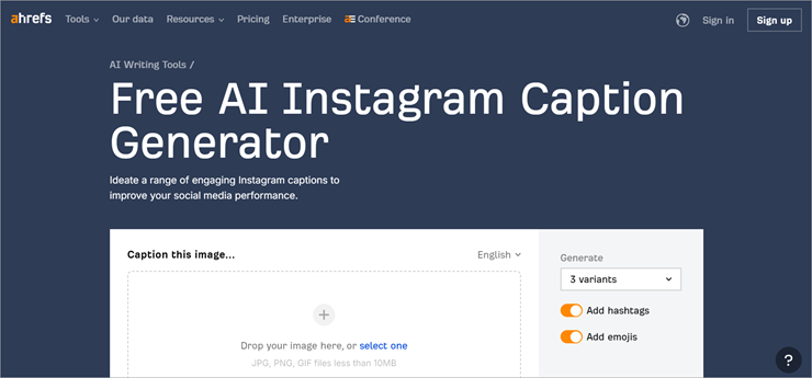 Ahrefs is quite an intuitive caption generator online. Unlike many of its contemporaries, it generates captions based on the images you upload. You start by uploading an image that you’d want a caption for. Ahrefs then presents your caption in 3-5 variants. Ahrefs also takes care of adding hashtags and emojis to your captions to make them more engaging.
