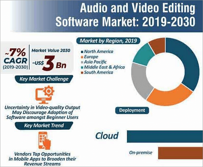 Market Trends: According to Transparency Market Research, within the timeframe of 2019-2030, the global market value of audio and video editing software is forecasted to grow at a CAGR of 7% and reach a net worth of $3 USD Billion by the year 2030.