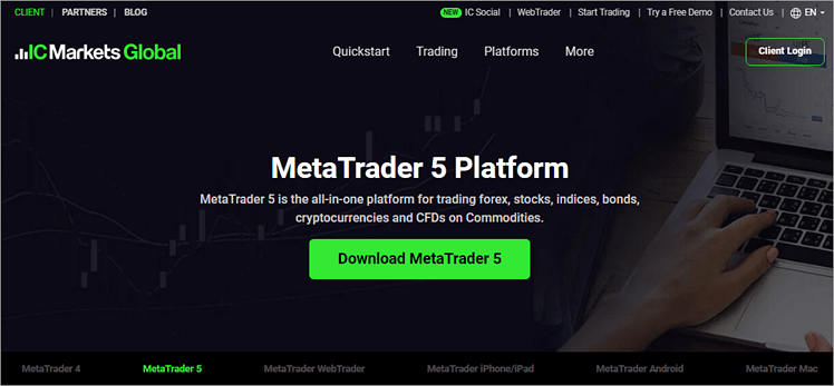 IC Markets supports trading with MT5 on ECN accounts called Raw Pricing accounts, and Standard accounts. The ECN broker IC Markets streams direct prices from 25 different liquidity providers, making it possible to provide tight spreads as low as 0 pips on major FX pairs.