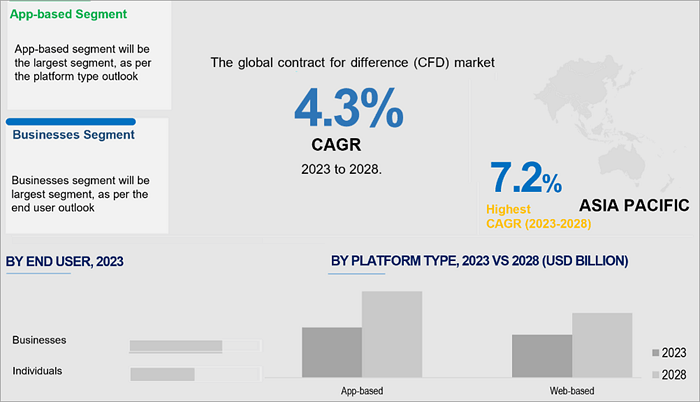 • The global contract for difference (CFD) market is expected to grow at a CAGR of 4.3% from 2023 to 2028 according to research by the Global Market Estimates Research & Consultants. Data from Absolute Markets Insights shows that the market will reach around $7,647.60 million by 2029 from a value of $5,754.63 million in 2020.