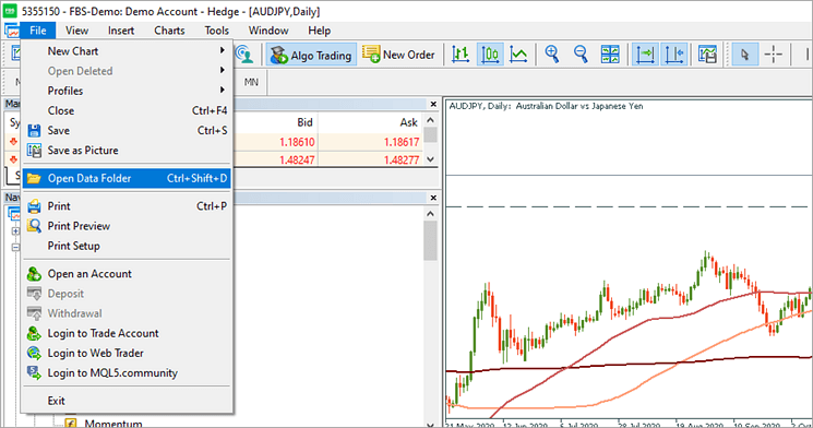 To use a robot, navigate to the File – Open Data Folder – MQL5 folder after installation. You will find indicators, expert advisors, scripts, and services. Once you download an Expert Advisor, you can place them in the folder so the platform will recognize and be able to use them.