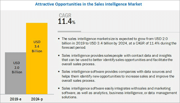 Market Trends: According to research by marketsandmarkets.com, the global sales intelligence market is expected to rise from $2 billion in 2019 to $3.4 billion in 2024 at a CAGR of 11.4%. Lead management is at the top in capturing the largest market size during the forecast period.