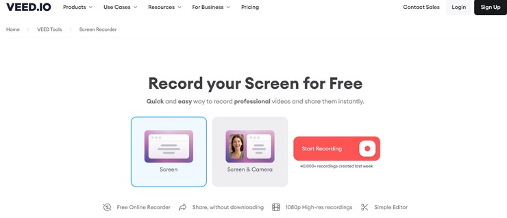 Veed is a tool you can use to record your screen, share your screen, and record your webcam. The software is perfect for anyone who wants to produce high-quality business presentations, gaming walkthrough videos, and other similar content. To start recording, you are provided with a collection of pre-made layouts.