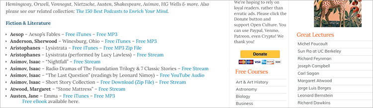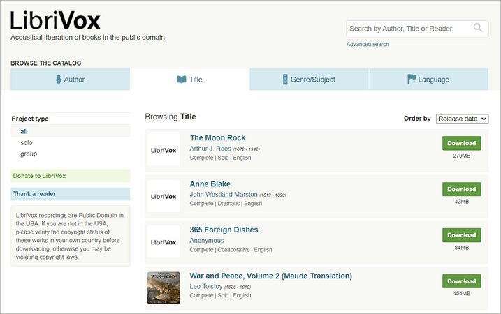 I love LibriVox for its huge collection of free audiobooks. Volunteers record these books by reading the chapters for books available in the public domain. You can search the books by author, genre, title, or language. What I love most about it is that I can listen to particular chapters of a book without having to download the entire book.