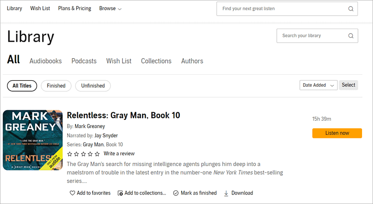 Our Review: I usually turn to hoopla for TV shows and movies. However, you will be amazed at its audiobook collection as well. Once here, you will find it hard to leave with so many options. The drawback- not all library cards can give you access to Hoopla. Find out if yours can.
