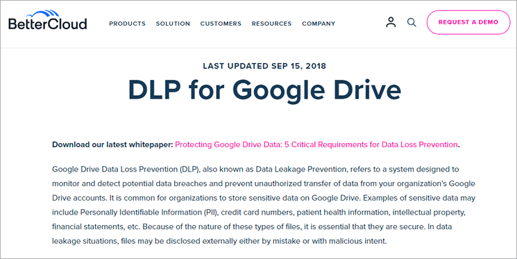 BetterCloud is built to prevent data breaches from the business’s Google Drive accounts. The software works by detecting and monitoring sensitive data, including PII, credit card details, patient health records, financial statements, etc., and prevents any unauthorized transfer of such data from the company’s Google Drive accounts.