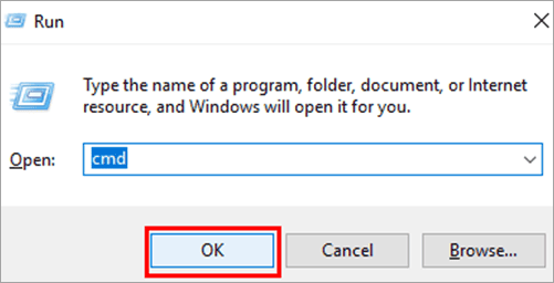a) Press the “Windows + R” button from the keyboard and a dialog box will open as shown in the image below. Now, type “cmd” in the search bar and click on “OK” to open the Command Prompt.