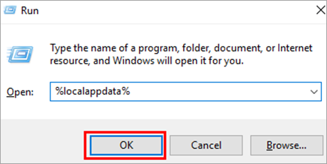 c) Press “Windows + R” from the keyboard and a dialog box will open. Now, type “%localappdata%” as shown in the image below and click on “OK”.