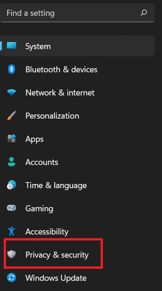#3) From the list on the left-hand side of the panel, select Privacy and Security.