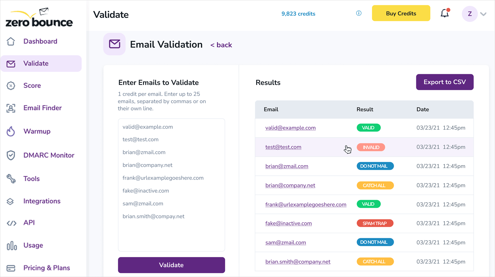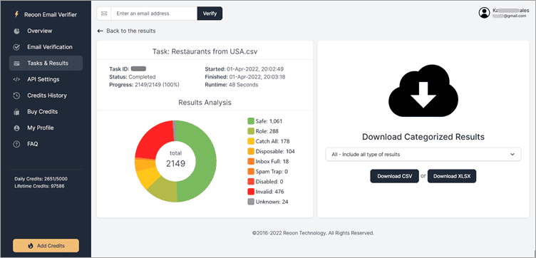 The cleaning tool then proceeds to verify and validate the emails on the list. Once done, you can download the clean email list in CSV format. The software performs multiple real-time checks to deliver results you can rely on. The verification process itself is very fast. Bouncify also allows you to verify emails via API.