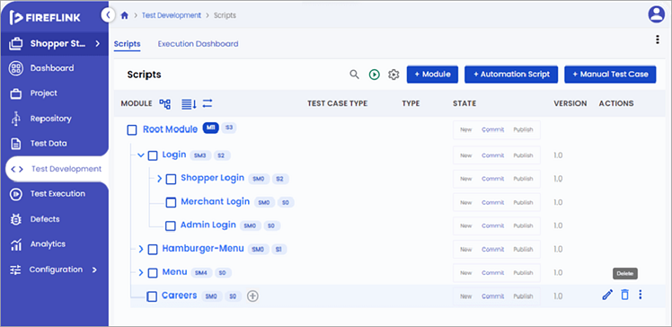 After creating the new project, the left panel of UI changes and lands on ‘Test Development’.