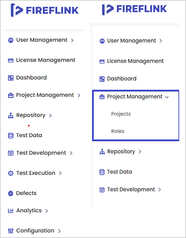 - Upon accessing the left navigation bar, the user will be directed to the Projects tab. From there, the FireFlink user can access three distinct sections: Projects, Users, and Roles, all under the All-Projects level.