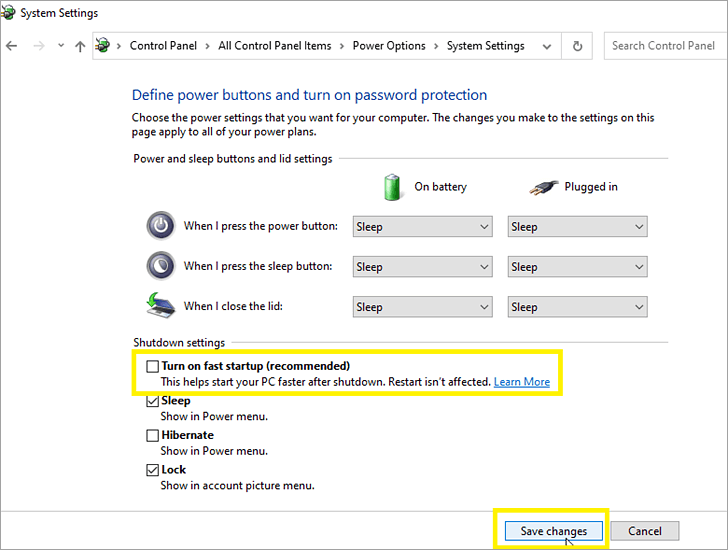 - Uncheck the selected checkbox for the option – Turn on fast start-up (recommended)