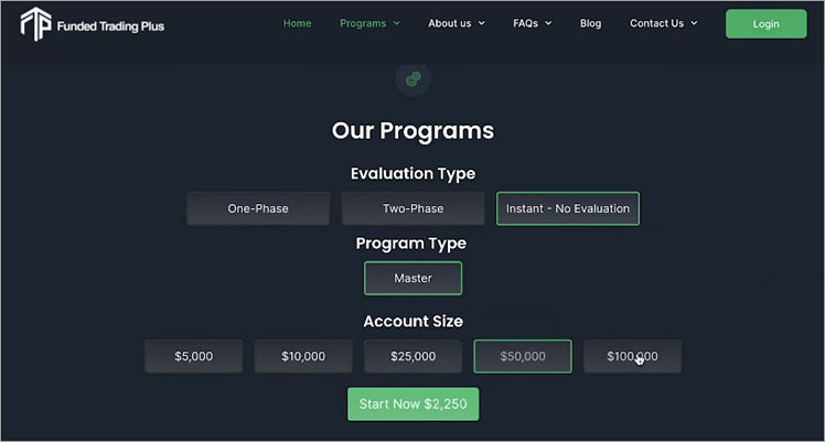 Step #1: Visit the website. Select a program and account size that is suitable for you from the options available. There are four programs and several options with regard to the account size you can start with.