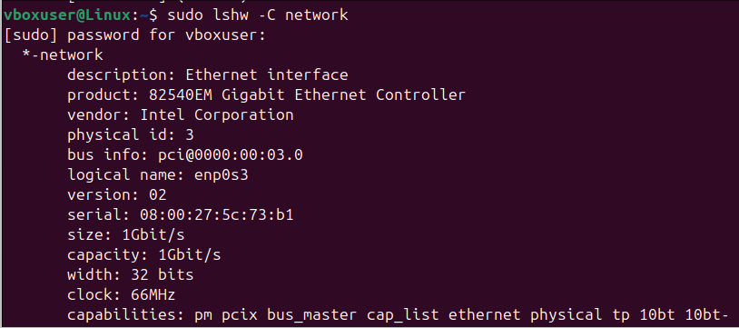 When you run the command sudo lshw -C network, you will be able to see information about your Linux system’s network card. You will see the Ethernet controller, size, capacity, and many other things.