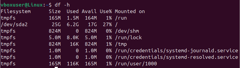 When you run the df command, you will be able to see the storage space used, available storage space, and the number of partitions available. The -h added to the command helps to display the information in a human-readable format.