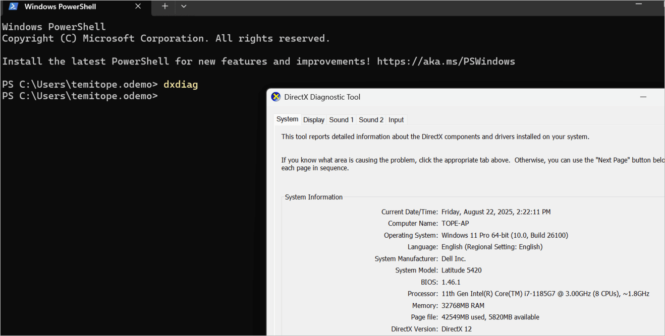 When you run the command dxdiag on your PowerShell or Command Prompt, a DirectX Diagnostic Tool page will display. Click on the System tab as shown in the image below, and you will see your System Information, like the System Model, BIOS, Processor, and Memory.