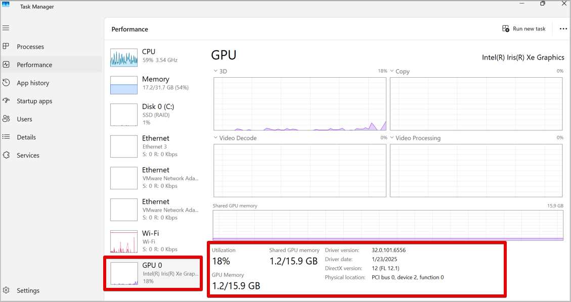 - In the Task Manager, click on the Performance menu, and among the listed components is GPU. Click it to see information on GPU utilization, GPU memory, and shared GPU memory as shown in the image below.