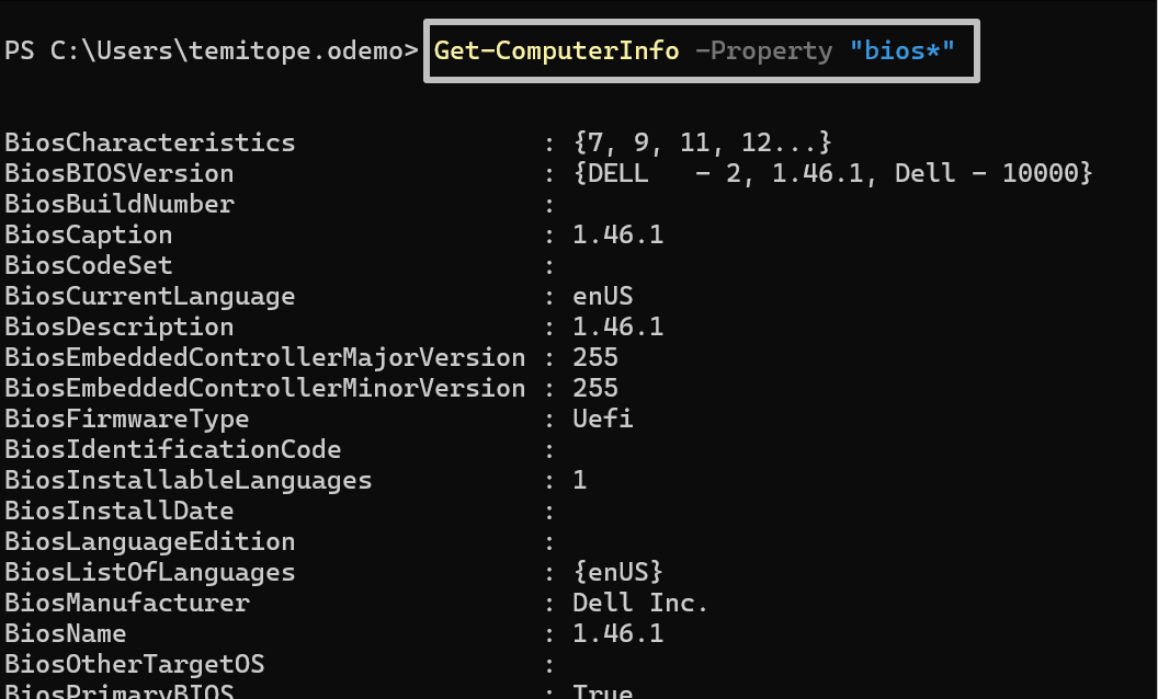 Please note that the asterisk (*) shown in the command is there to serve as a wildcard to match every property that starts with BIOS on the system.