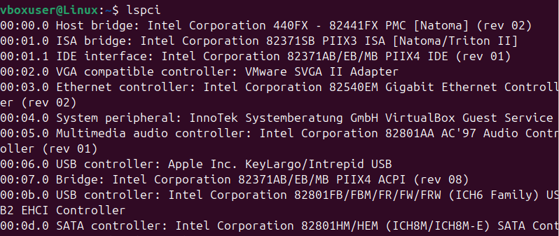 To display this, other controllers run the lspci command, and you will be able to see the controllers connected to your system’s PCI buses, like the Host bridge, Ethernet controller, Multimedia audio controller, USB controller, and VGA compatible controller.