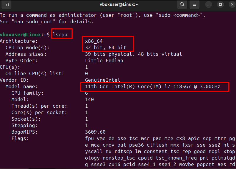 This command will display the Model name, the processor architecture, the vendor, the CPU family, virtualization features, and many more.