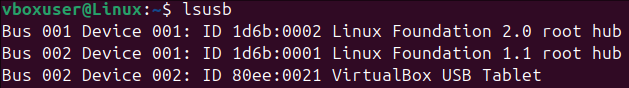 Run the lsusb command to display information about devices currently attached to your system. These devices can be a USB device, an external disk reader, or many more.