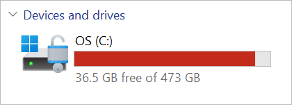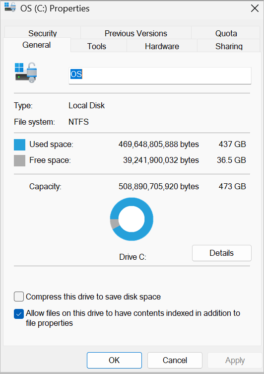 My system drive properties show 473 GB as the total storage capacity on my system. It also shows that I have a used space of 437 GB and free space of 36.5 GB left on my system.