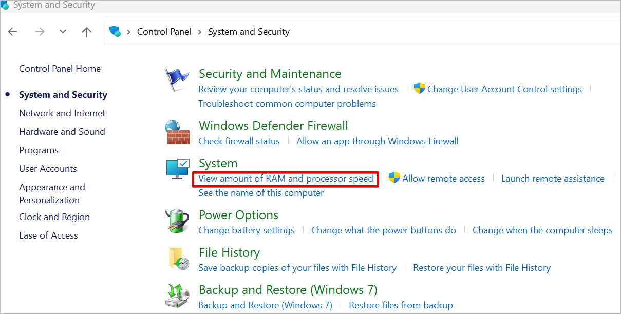 3. Click System or View amount of RAM and processor speed as shown below.