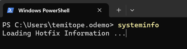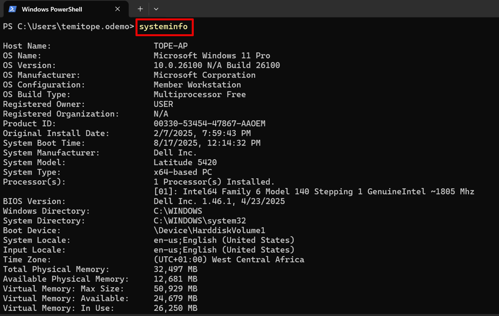 Open PowerShell or Command Prompt. Enter the command systeminfo and press Enter.