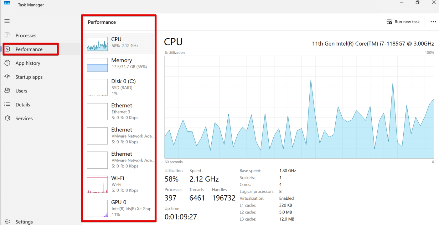 2. In the Task Manager, click on the Performance menu as shown below, and you will see the different system components. To learn more about a specific component, click on it.