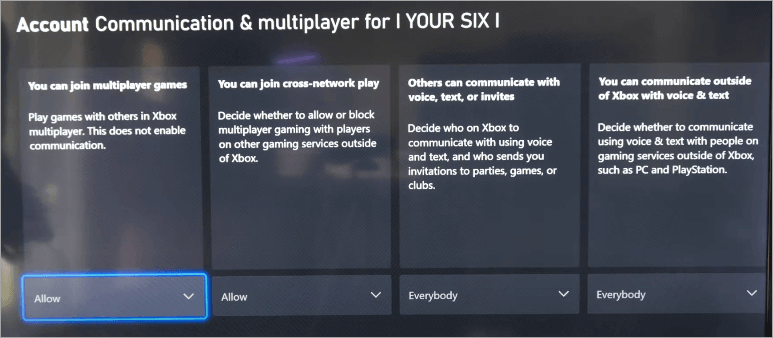 Navigate to Press your Profile -> Settings -> Account -> Privacy & Online Safety -> Type your pass key if any -> Xbox privacy -> View details & Customize -> Communication & Multiplayer. From the drop-down menu under ‘You can join multiplayer games’, ensure it is allowed. Do the same for other options.