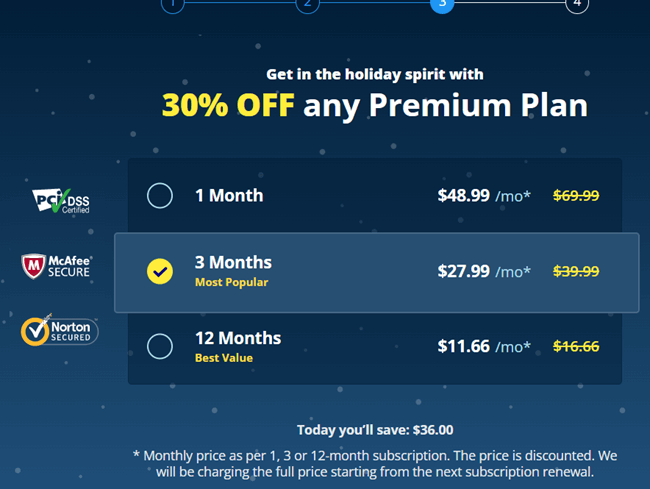 Price: 1 month – $48.99/month, 3 months – $27.99/month, 12 months – $11.66/month.