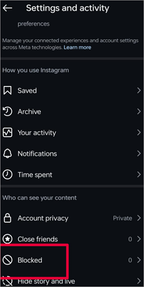 Step #2: Tap on the three horizontal lines option and scroll down to the section “Who can see your content?” You will find a Blocked option there.