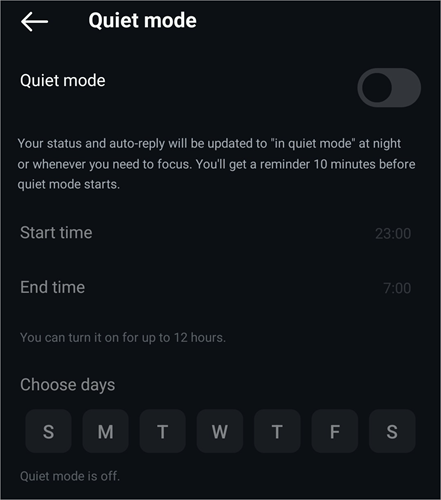I like just how flexible Quiet Mode is. In Quiet Mode, you can set the time and date for pausing your notifications. Based on your preference, you set the start and end times and the days on which you wish to pause your notification. You’ll be notified ten minutes before the Quiet Mode goes into effect.
