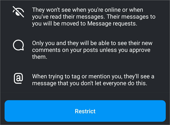 A restricted user won’t know when you are online or when you read their messages. Their comments on your posts will only be visible to you and them. They also won’t be able to tag or mention you in their posts.
