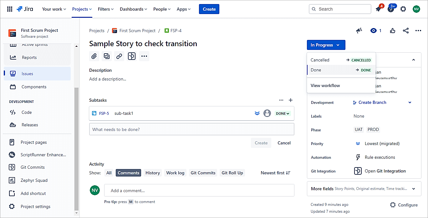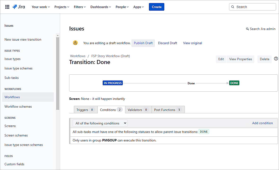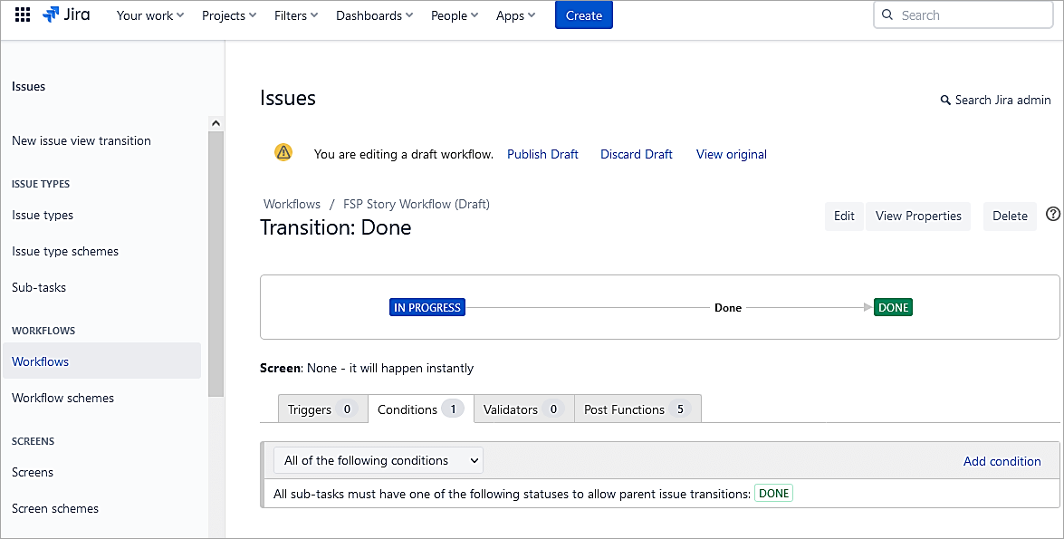 To test the condition in the example below, you can see that the Story issue cannot transition to Done status unless the Sub-task is in the Done state.