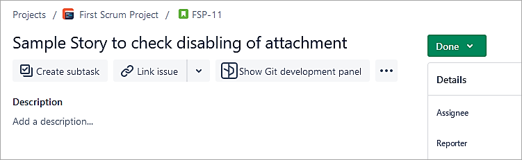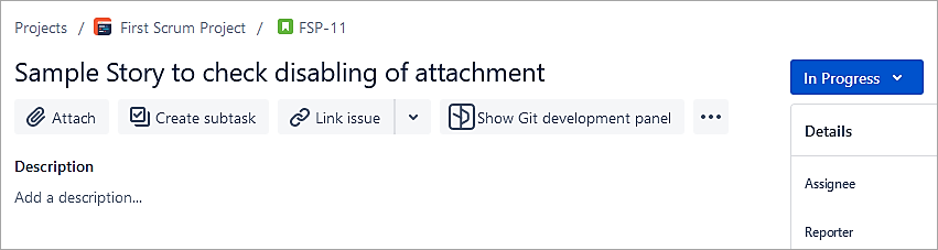 For the Story in the In Progress status, the attachment is enabled.