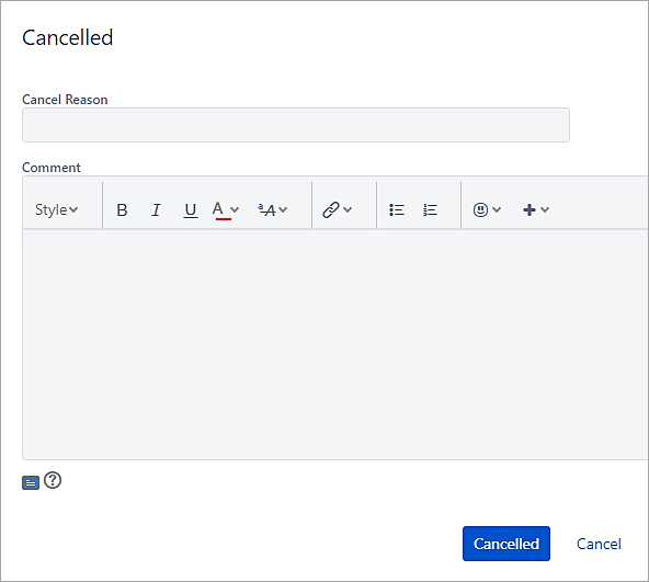 This example will focus on the transition to the Cancelled status. When the user transitions to the Cancelled status, the field ‘Cancel Reason’ should pop up.